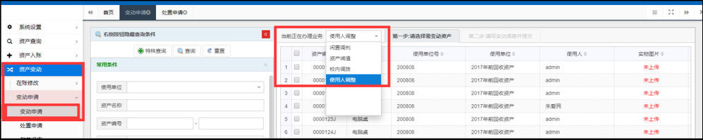 1.如图所示,变动申请,以使用人调整为例,当前正在办理业务选择使用人调整。
