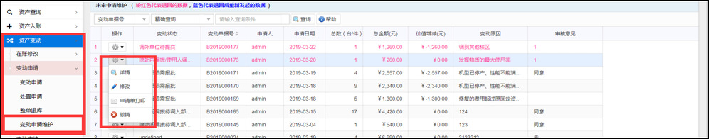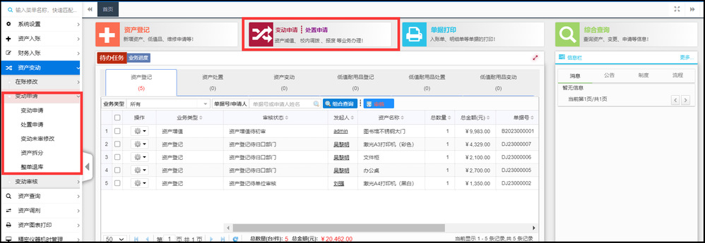 操作菜单为:首页“变动申请”快捷菜单或左侧“资产变动→变动申请→变动申请”菜单。