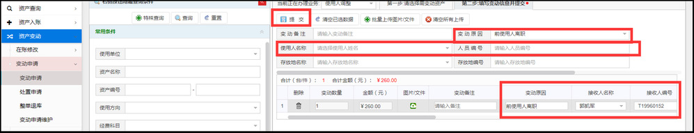 3.如图,先填写必填信息变动原因及调拨使用人名称,然后点击提交,并提交审核。