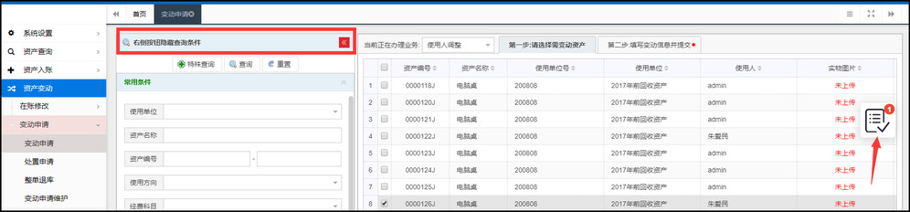 以【使用人调整】为例,点击【使用人调整】,显示下图的界面,您可通过【查询条件】筛选出要调整的数据信息,勾选后,填写变动信息并必须【提交】,再由上级资产管理员进行审核。